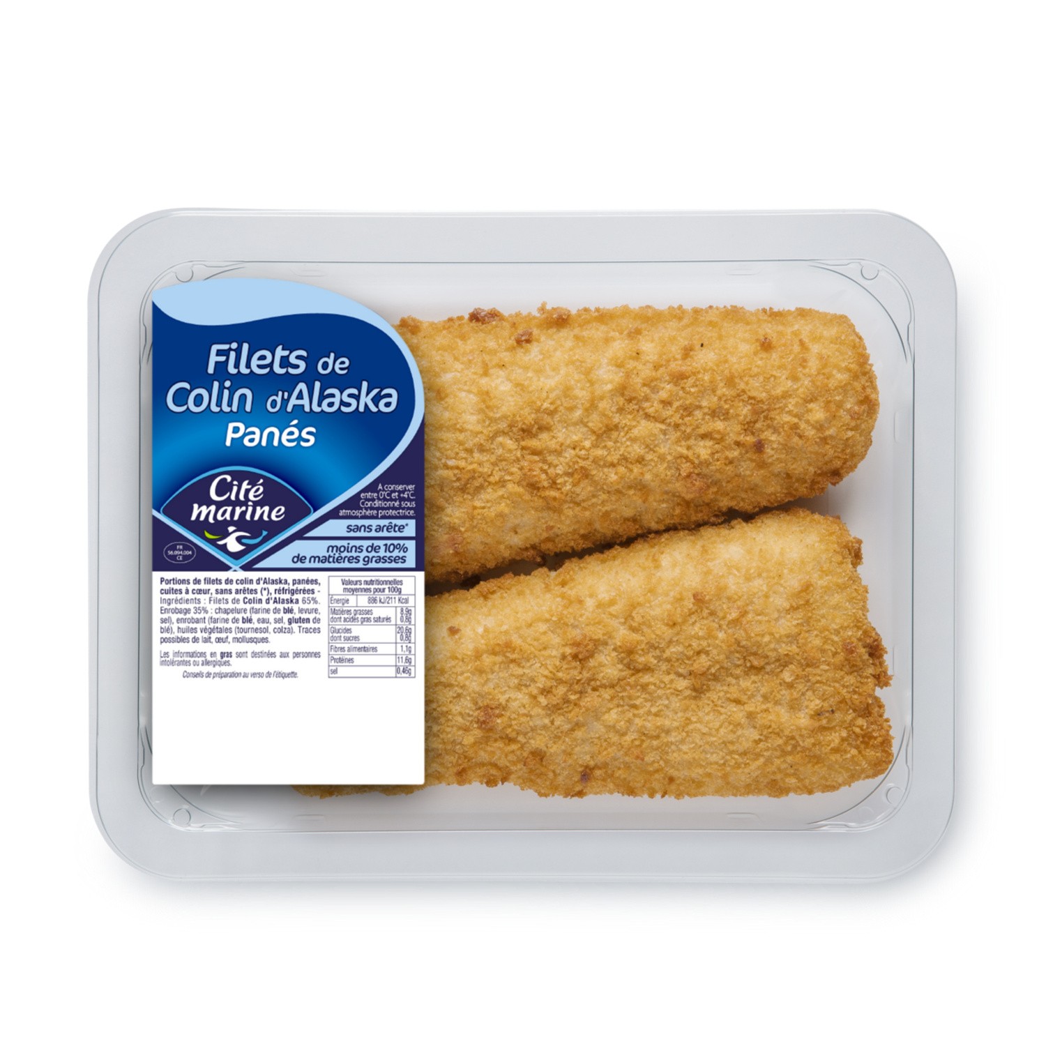 Filet de Colin d'alaska Pané. Ingrédients : Filets de colin d'Alaska 65%. Enrobage 35% : chapelure (farine de blé, levure,sel), enrobant (farine de blé, eau,...