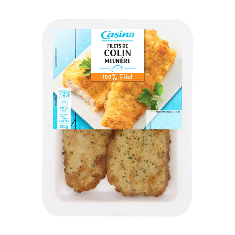 Filet de colin meunière. Ingrédients : Filet de colin d'Alaska (poisson) 75%. Enrobage 25% : eau - huiles végétales (tournesol, colza) - farine de blé...
