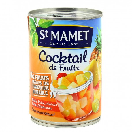 Cocktail de fruits. Ingrédients : Pêches en cubes, poires en cubes, segments d'ananas, raisins, bigarreaux dénoyautées colorés avec E127, eau, sucre, acidifiant : acide citrique,...
