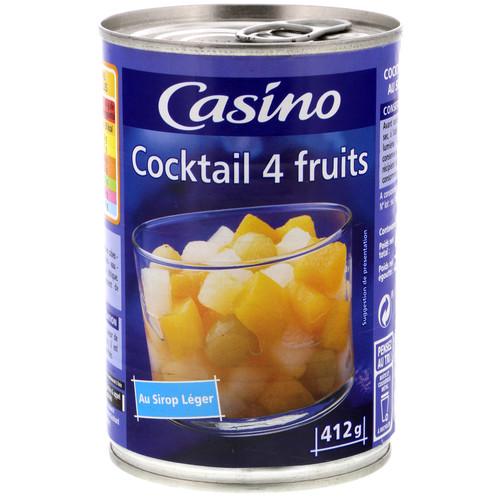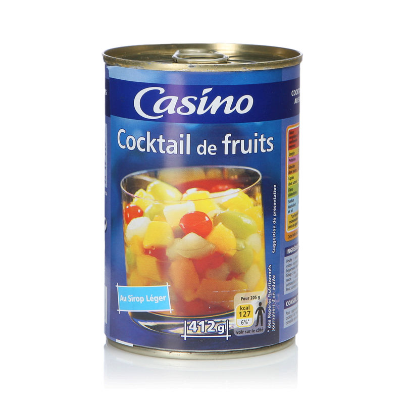 Cocktail de fruits au sirop léger. Ingrédients : Pêches en cubes, poires en cubes, segments d'ananas, raisins, bigarreaux dénoyautés colorés avec E127, eau, sucre, acidifiant...