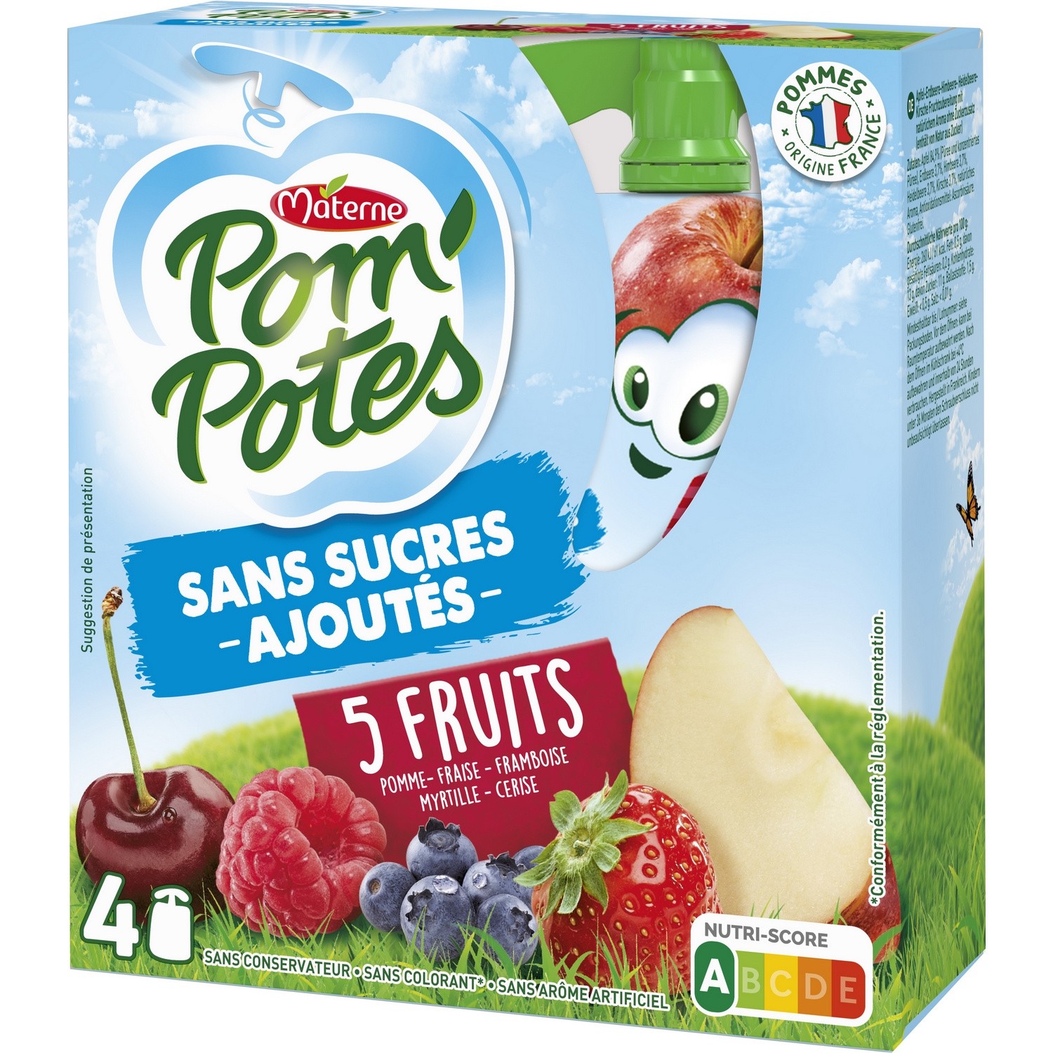 Spécialité de fruits sans sucres ajoutés. Ingrédients : Pomme 84,9% (purée et purée concentrée), cerise 3,7%, fraise 3,7%, framboise 3,7%, myrtille 3,7%, arôme naturel, antioxydant...