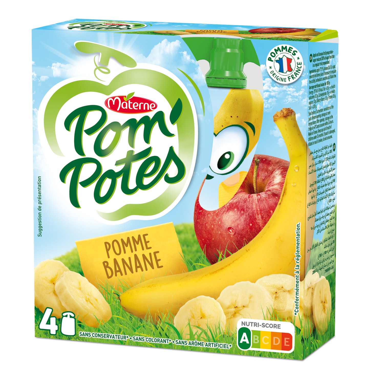 Compote multifruit pomme banane allégée en sucres (30 % de sucres en moins). Ingrédients : Pomme 77,9 %, banane 20,4 %, sucre, jus de citron...