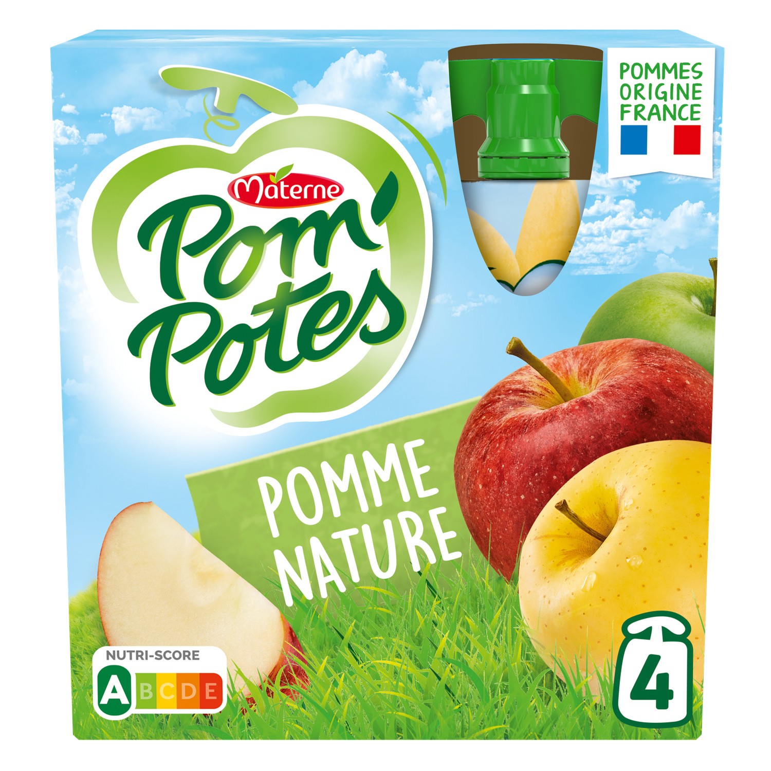 Compotes pomme nature. Ingrédients : pomme 95,5%, sucre, antioxydant : acide ascorbique Quantité : 360 g (4 x 90 g) Marque : Materne Origine :...