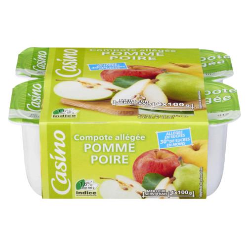 Compote de pommes et de poires allégée en sucres (*30% de sucres en moins par rapport à une compote classique). Ingrédients : Purée de pommes...