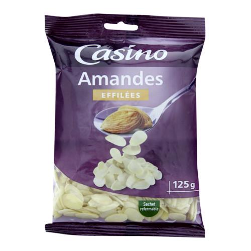 Amandes effilées. Ingrédients : _Amandes_ effilées 100%. Traces d'autres _fruits à coque_ et d'_arachides_ Quantité : 125 g Marque : Casino