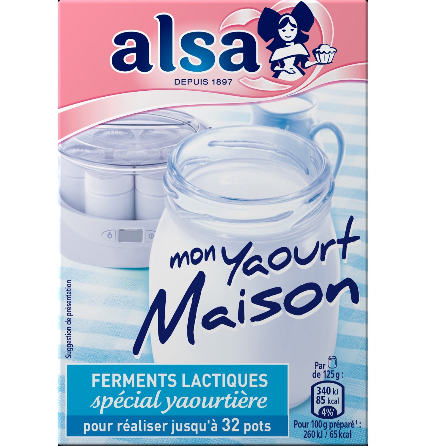 Ferments lactiques pour préparation de yaourts. Ingrédients : Ferments lactiques lyophilisés (streptococcus thermophilus et lactobacillus bulgaricus) sur maltodextrine. Quantité : 8 g Marque : Alsa...