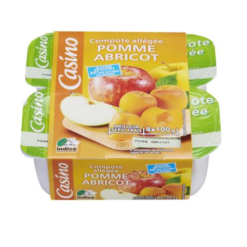 Compote de pommes et d'abricots allégée en sucres (30% de sucres en moins par rapport à une compote classique). Ingrédients : Purée de pommes 70,5%...