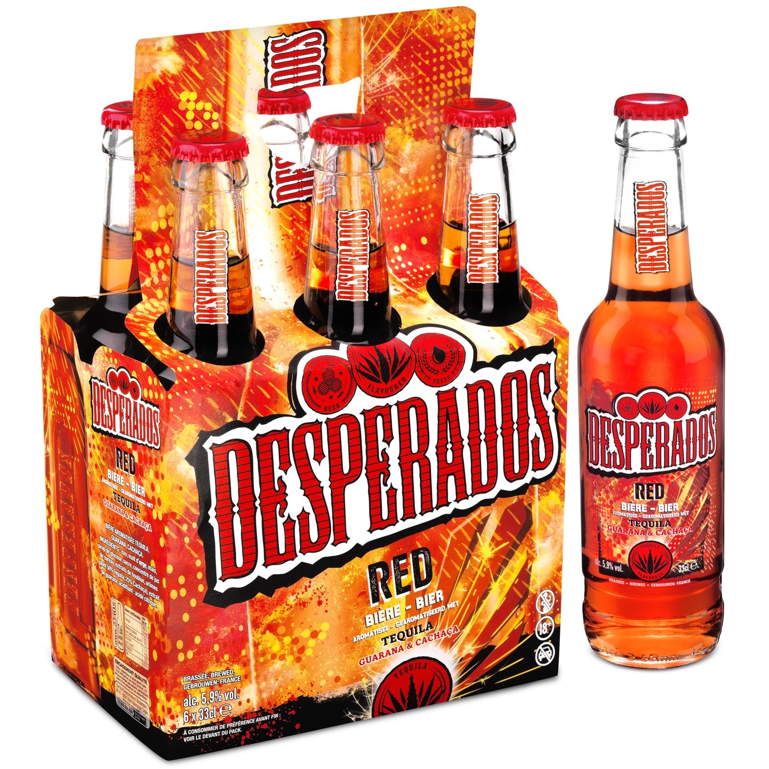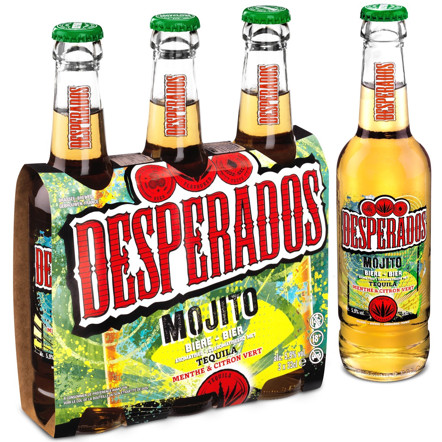 Desperados mojito. Ingrédients : Eau, malt d'orge, mais, sirop de glucose, sucre, extraits de houblon, arômes naturels (dont 50% de Tequila, menthe, citron vert), acidifiant...