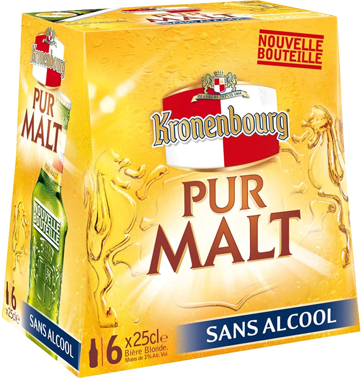 Kronenbourg Pur Malt sans alcool. Ingrédients : Pur malt dont 3 types de malt : le malt pâle, le malt de blé et le malt...