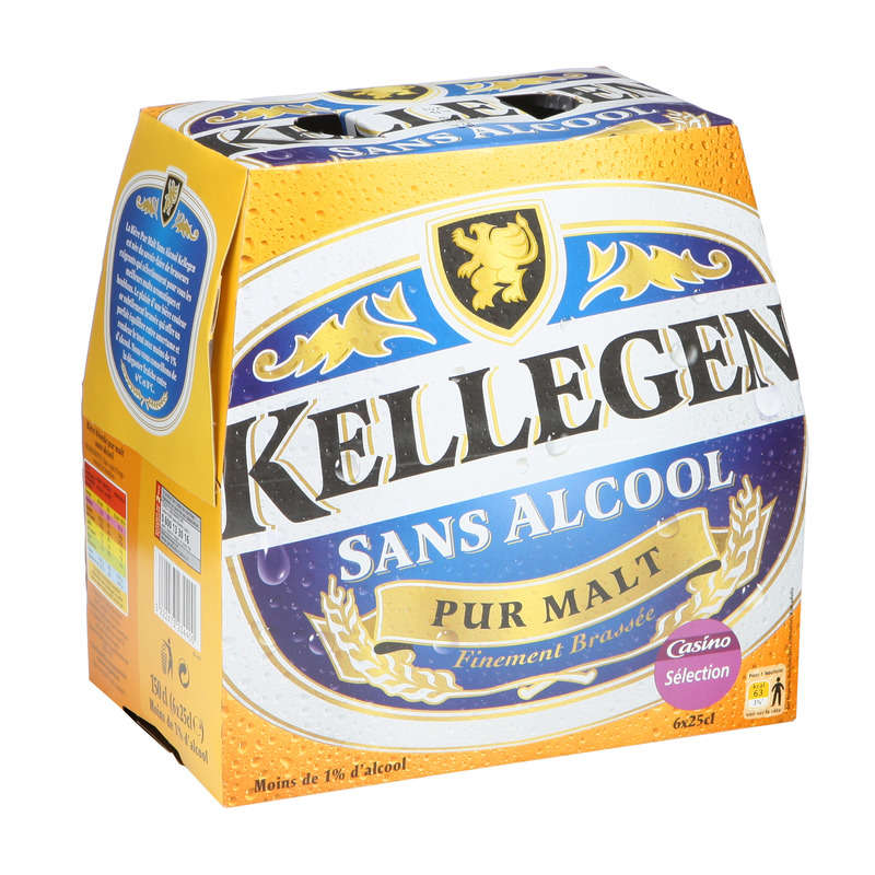 Bière sans alcool. Ingrédients : Eau - malt d'_orge_ - extraits de houblon. Quantité : 6 x 25 cl Marque : Kellegen