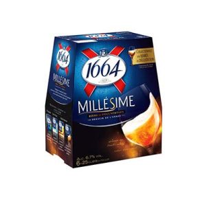 Millésime Bière de Dégustation. Ingrédients : Bière de dégustation (contient du malt d'_orge_ et des _sulfites_). Quantité : 6 * 25 cl Marque : 1664...