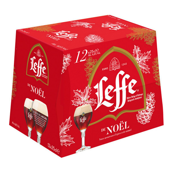 Bière de Noël. Ingrédients : Eau, malt d'_orge_ maïs, _orge_, houblon, sucre. Quantité : 25 cl Marque : Leffe