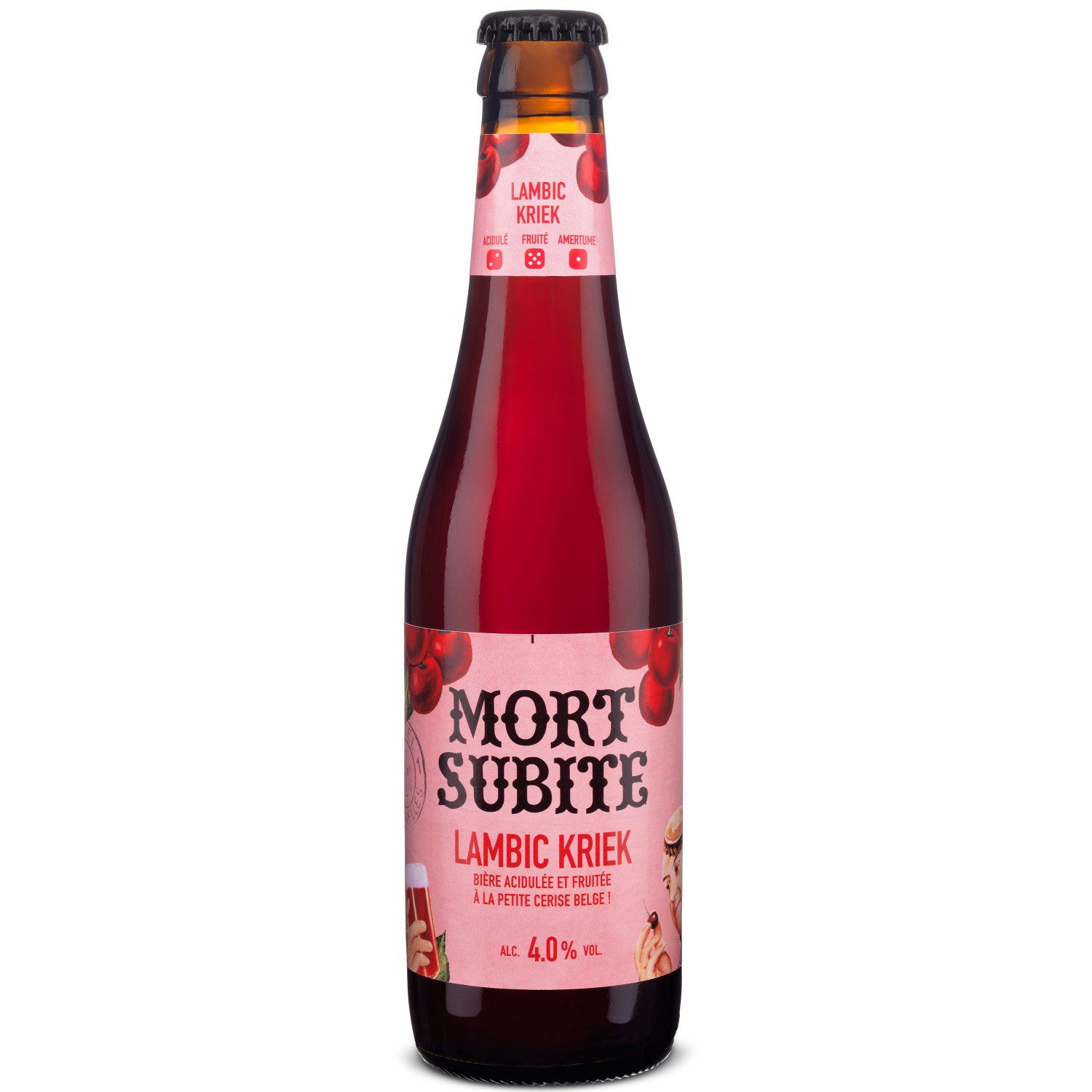 Mort subite kriek lambic. Ingrédients : EAU, JUS DE CERISE À BASE DE CONCENTRÉ (19,8%), MALT D'ORGE, SIROP DE FRUCTOSE-GLUCOSE, BLÉ. CERISES (1,2%), l EXTRAIT...