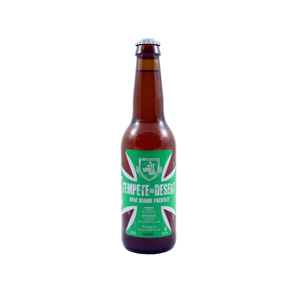 Tempête du Désert. Ingrédients : Eau, malts d'_orge_, malts de _blé_, houblons. Quantité : 33 cl Marque : Sainte Cru