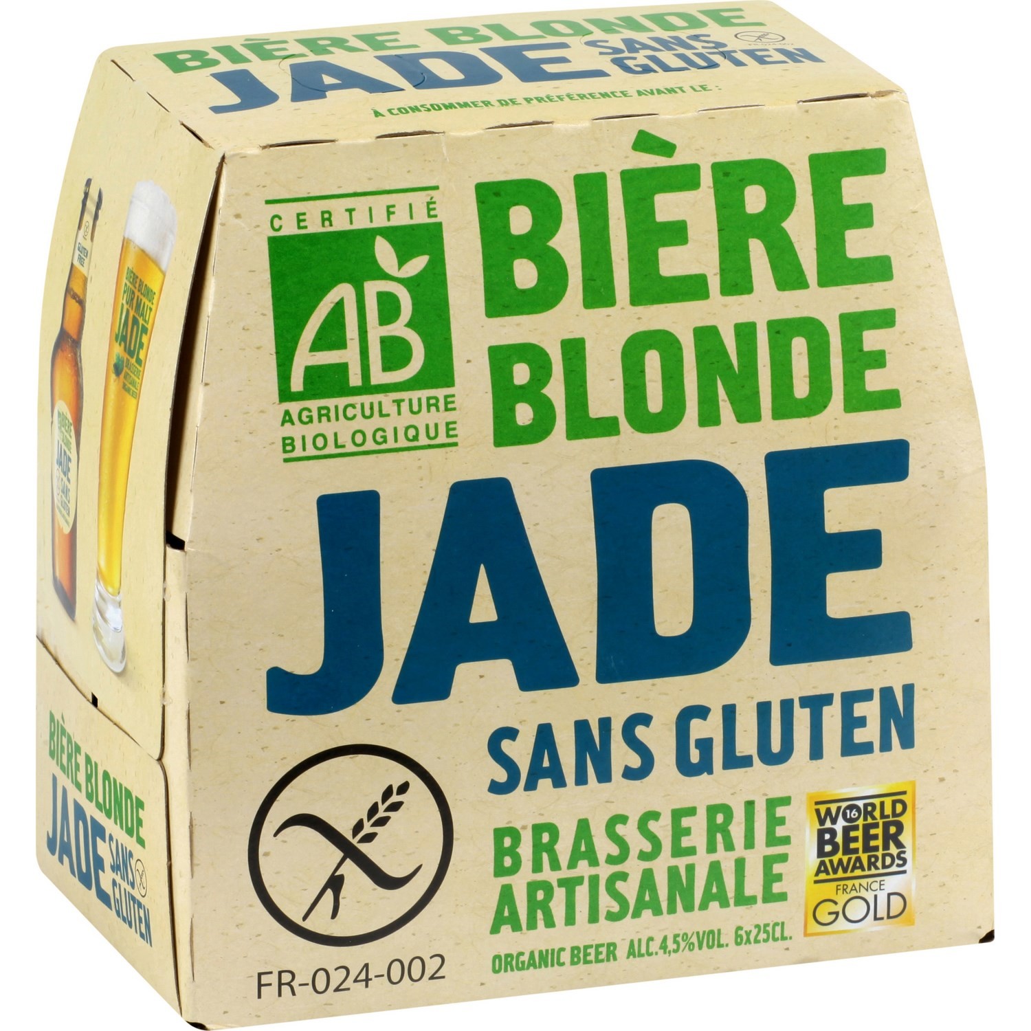 Bière Blonde Jade Sans Gluten. Ingrédients : eau, malt d'_orge_*, houblons* (*issus de l'Agriculture Biologique). Quantité : 1,5 L (6 * 25 cl) Marque :...