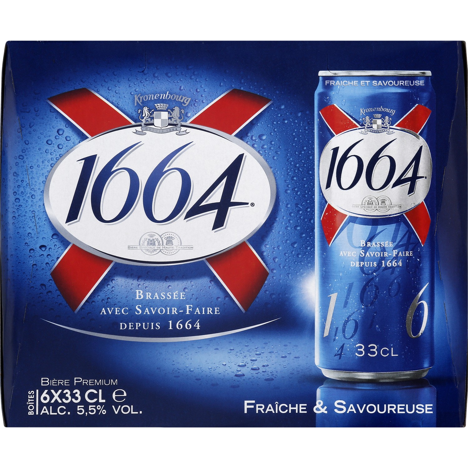 Bière blonde, 5,5% vol.. Ingrédients : Eau, malt d'orge, sirop de glucose, malt de ble, ble, extrait de houblon Marque : 1664
