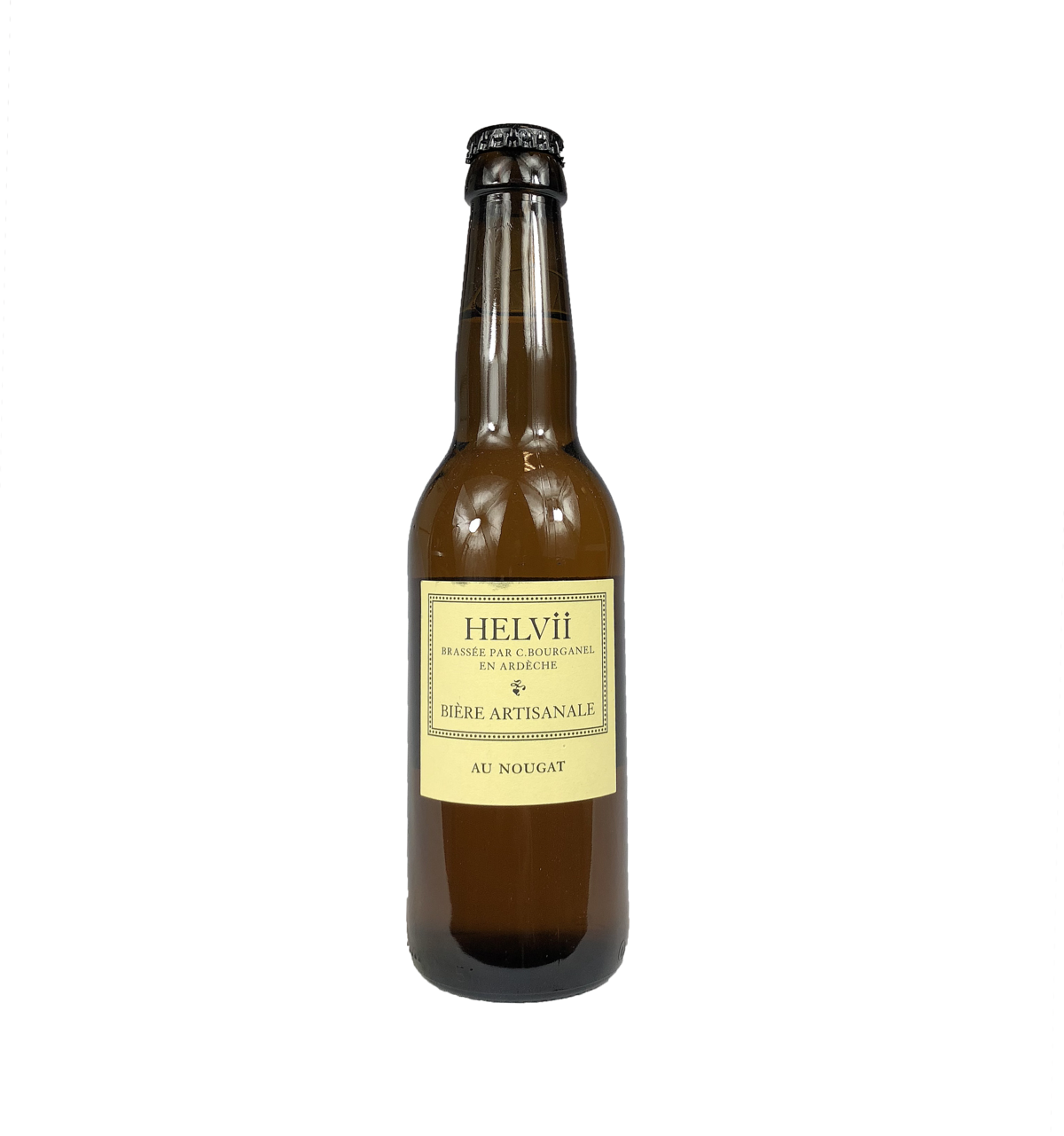 HELVII. Ingrédients : eau malt d'orge (contient du gluten) crème de nougat 1.5% (amandes émondées grillées, sucré, sirop de glucose, miel, arôme naturel de vanille,...
