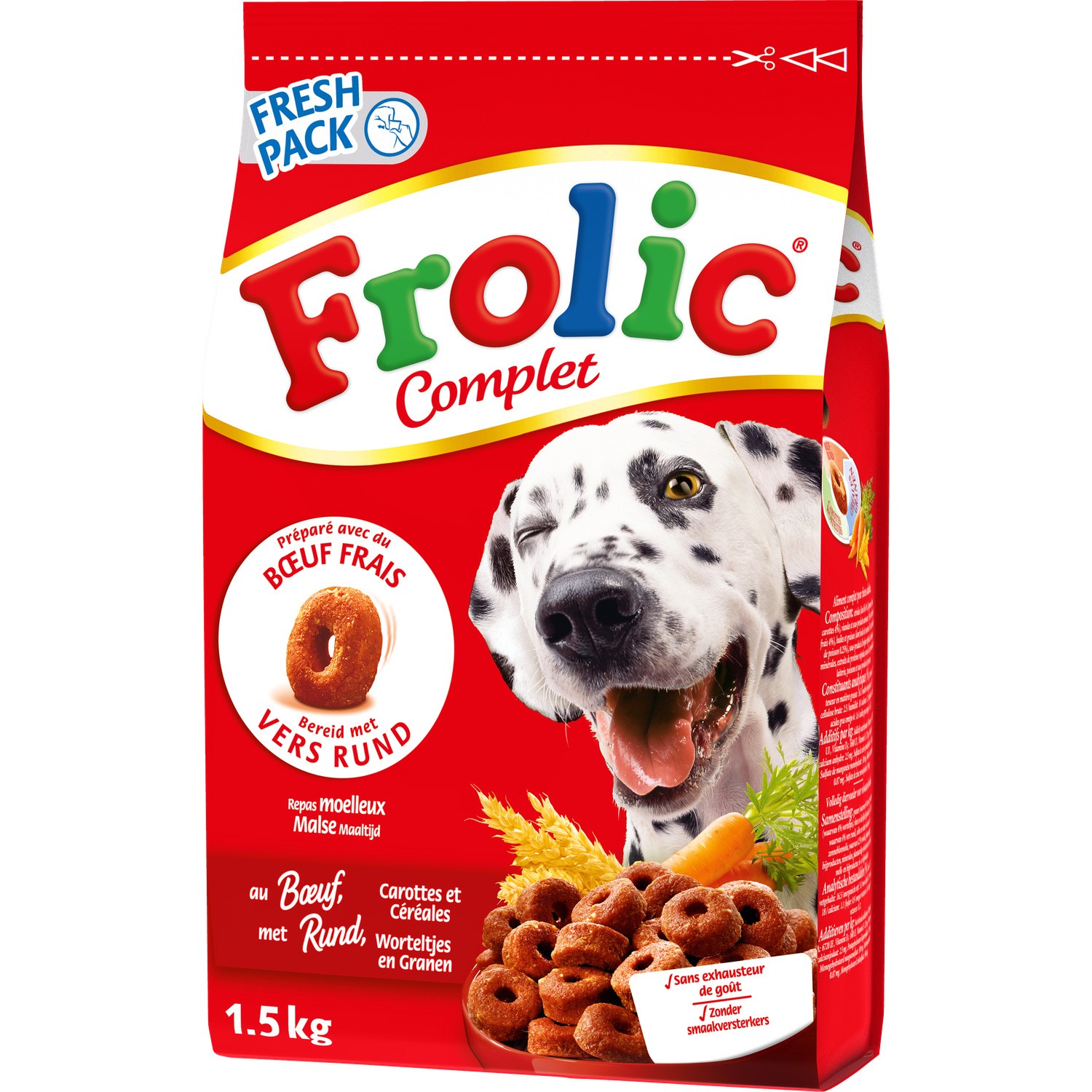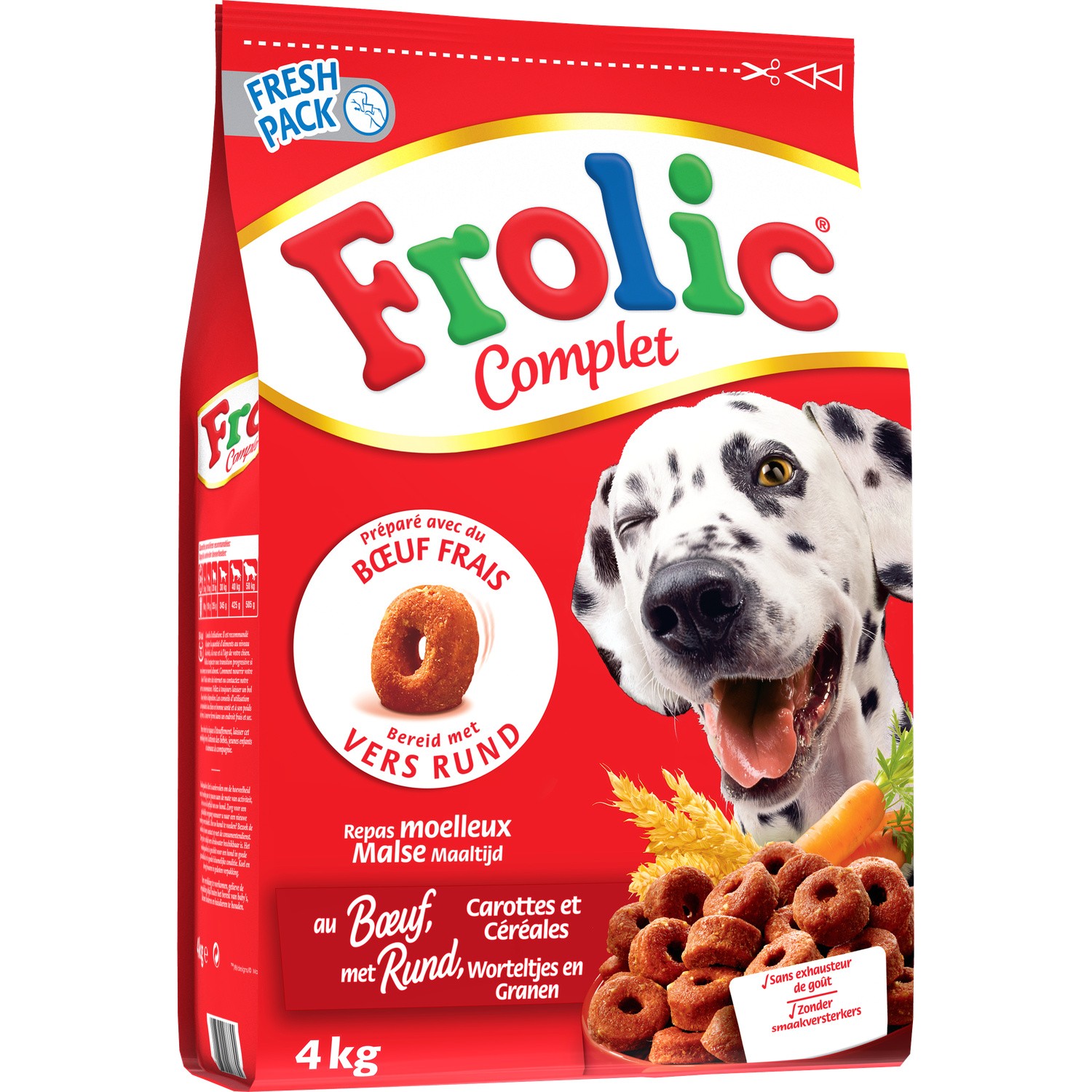 frolic complet. Ingrédients : Aliment complet pour chiens adultes. Composition: céréales (dont blé 4%), légumes (dont carottes 4%), viandes et SOs-produits animaux (14%, dont buf...