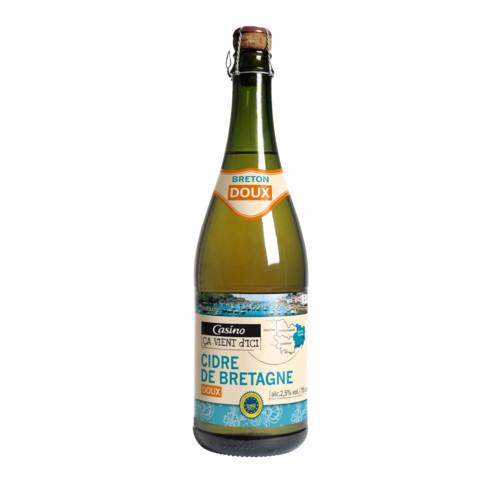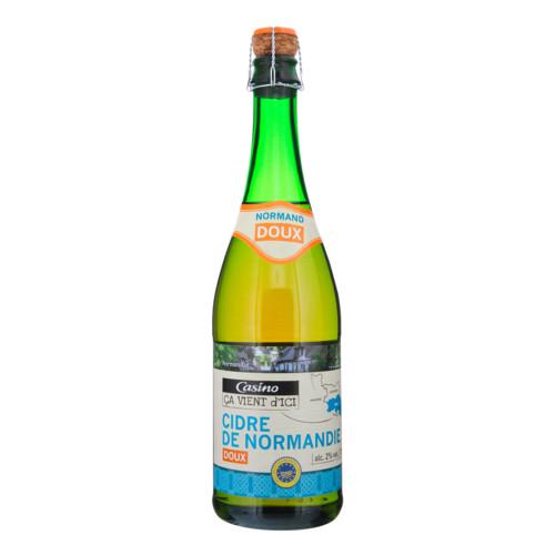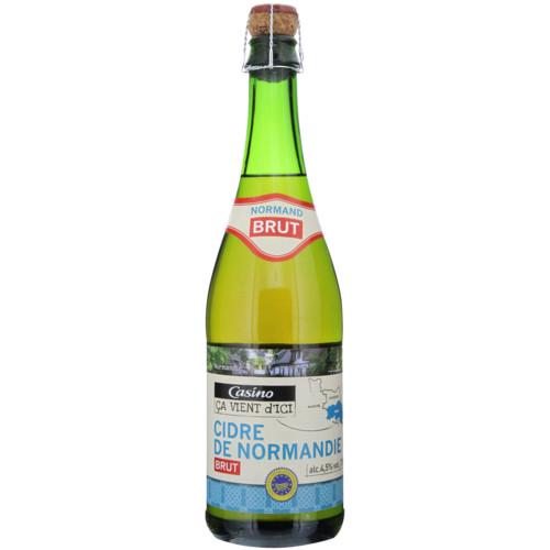 Cidre bouché de Normandie brut. Ingrédients : Contient des _sulfites_. Quantité : 75 cl Marque : Casino,Casino Ca Vient D'Ici