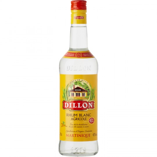 Rhum blanc agricole AOC Martinique. Ingrédients : Rhum agricole Quantité : 70 cl Marque : Dillon Origine : Martinique