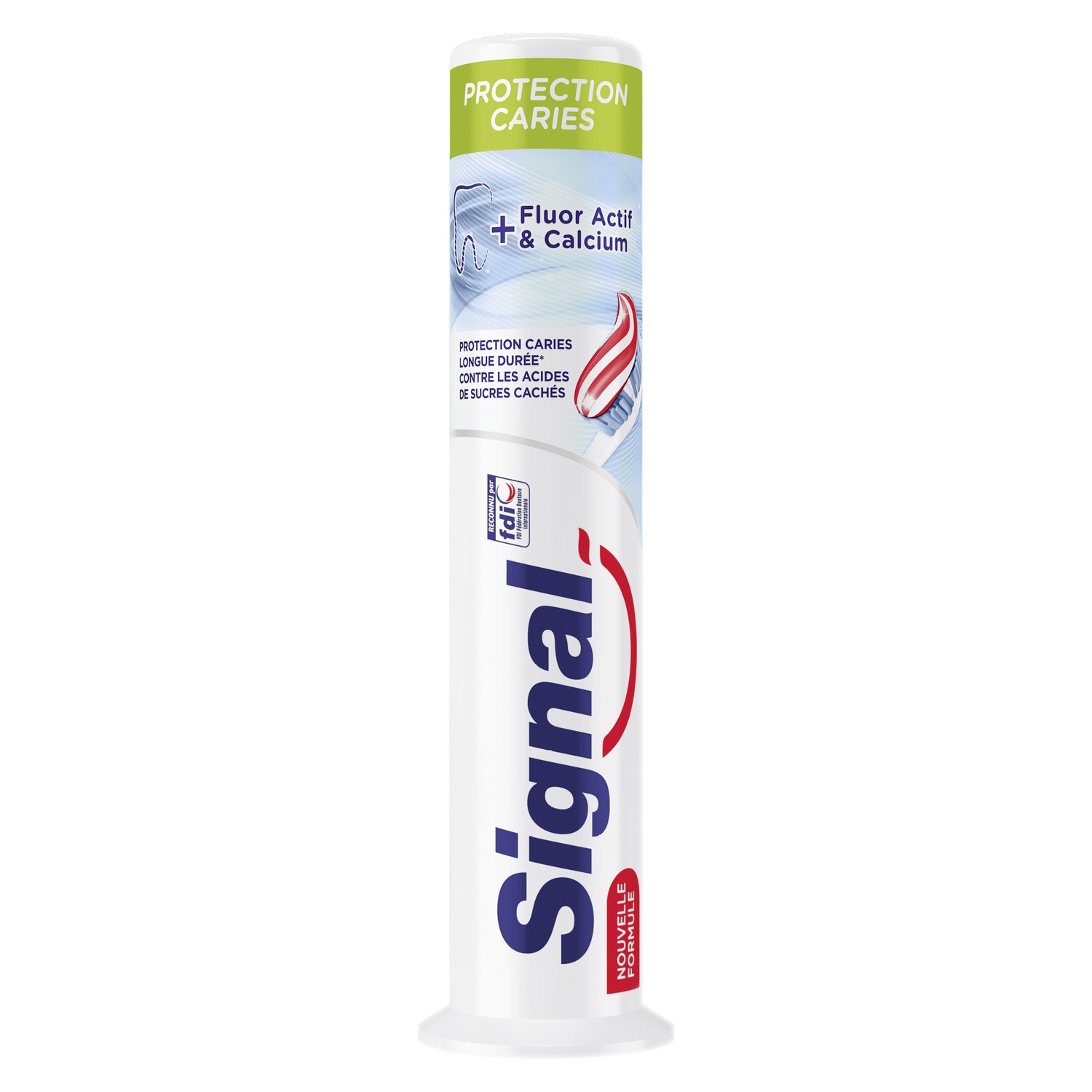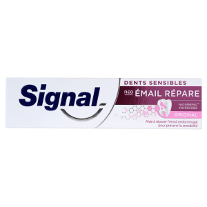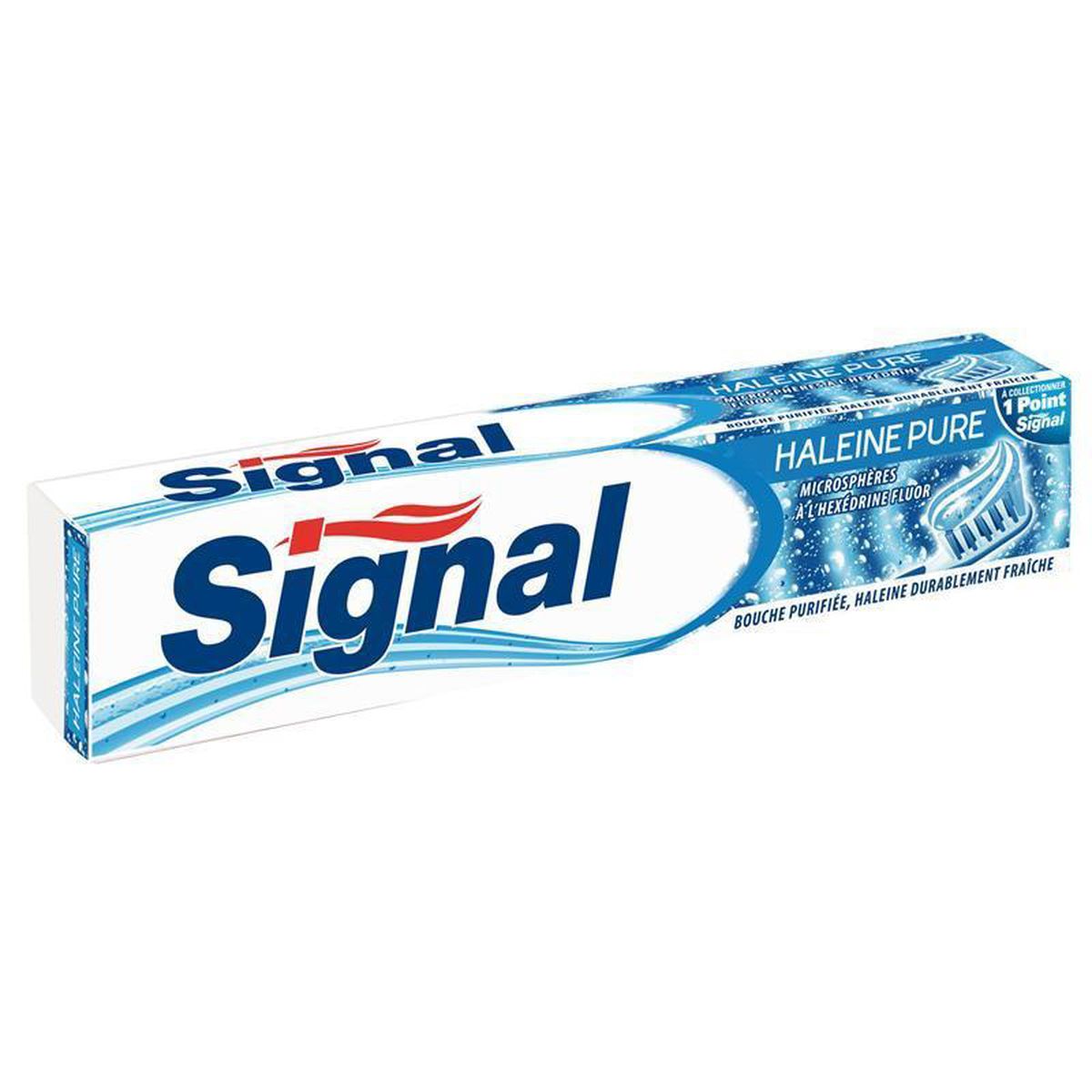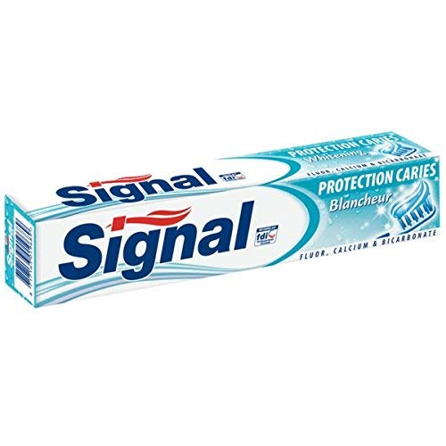 dentifrice Signal. Ingrédients : glycerin, calcium silicate, PEG-8, hydrated silicate, trisodium phosphate, aqua, sodium lauryl sulfate PEG-60, Aroma, sodium monofluorophosphate, synthetic fluophlogopite, sodium saccharine, polyacrylik...