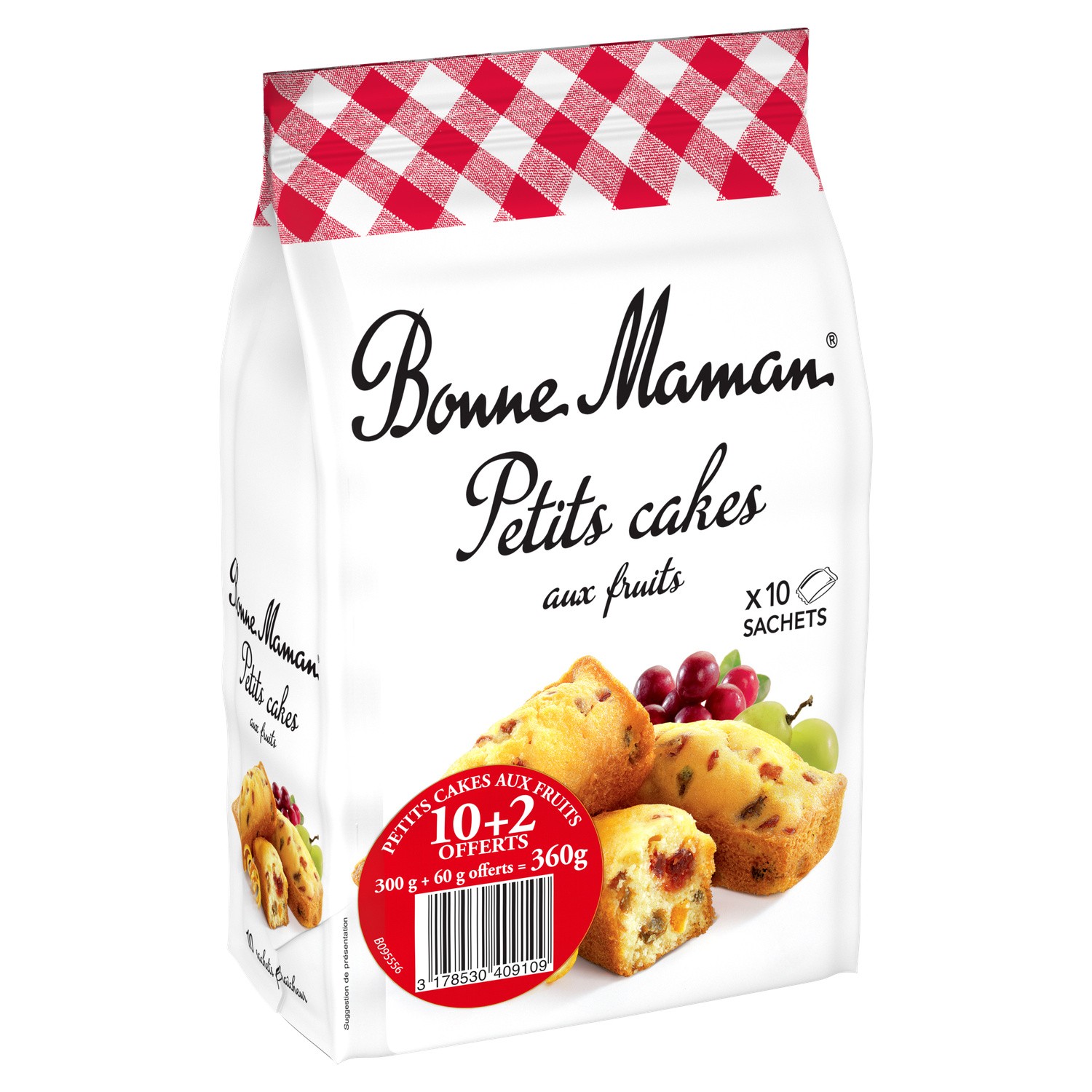 Petits cakes aux fruits. Ingrédients : Farine de blé tendre, œufs frais, beurre frais, sucre, raisins au rhum 9% (raisins secs 7,2%, rhum), oranges semi-confites...