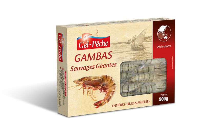 Crustacès, gambas calibre 7/10. Ingrédients : Crevettes (_crustacès_), antioxydant : _disulfite_ de sodium. Quantité : 500 g Marque : Gel-Pêche Origine : Océan Indien
