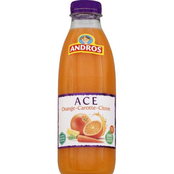 ACE Orange Carotte Citron. Ingrédients : jus d'oranges 49%, jus de pommes 24,5%, eau, jus de carottes 10%, jus de citrons jaunes 3%, vitamines A,...