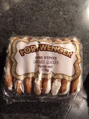 Pains d'épices Langues Glacées. Ingrédients : Farine de froment (_gluten_), sucre, miel, épices, poudre à lever : carbonate acide d'ammonium, carbonate acide de sodium, blanc...
