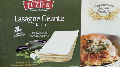 Lasagnes a garnir géantes.Ingrédients : Lassagne Géante à farcir. Pâte Alimentaire de Qualité Supérieure. Semoule de blé dur de qualité supérieure, eau. Contient du gluten....