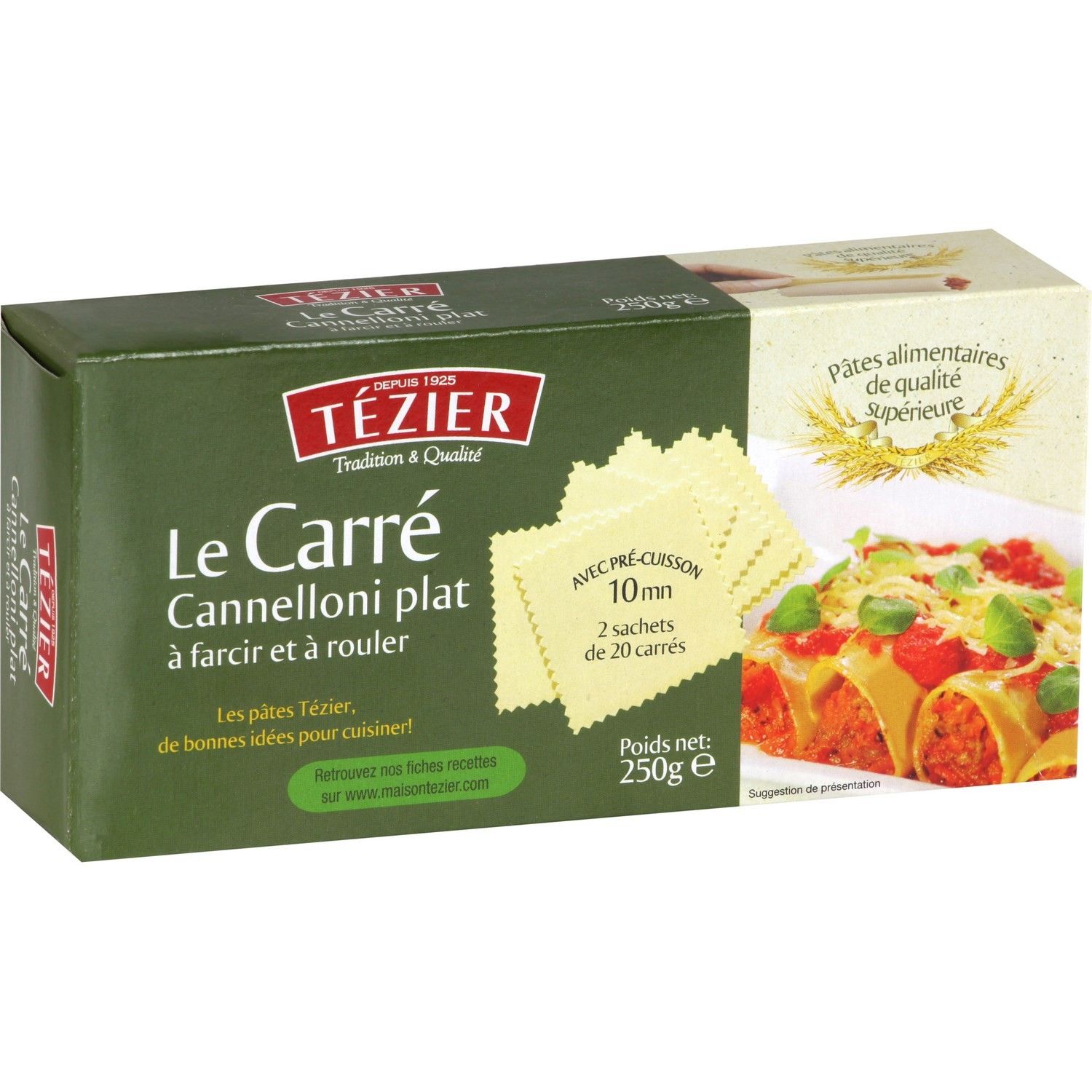 Cannelloni à farcir (42).Ingrédients : Semoule de blé dur de qualité supérieure, eau. Contient du gluten. Peut contenir des traces d'oeuf.Quantité : 250gMarque : Tezier...