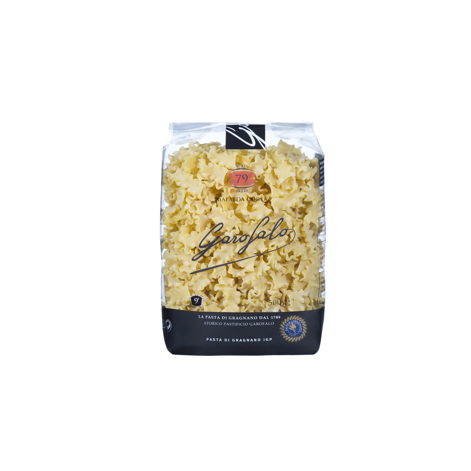 Mafalda Corta N°79.Ingrédients : Semoule de _blé_ dur de qualité supérieureQuantité : 500 g eMarque : Garofalo