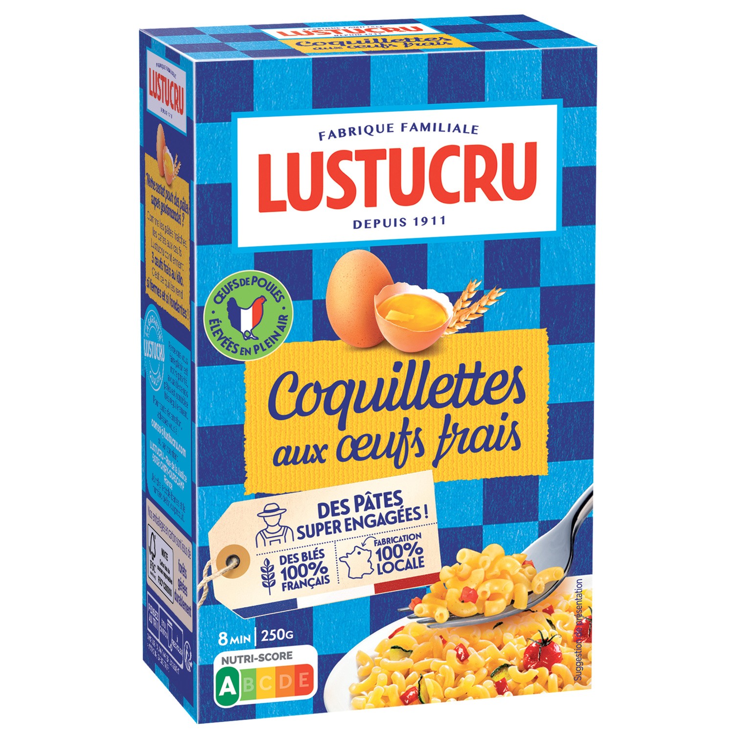 Pâtes alimentaires aux œufs frais.Ingrédients : Semoule de blé dur de qualité supérieure, œufs frais (13,5 %).Quantité : 250 gMarque : Lustucru