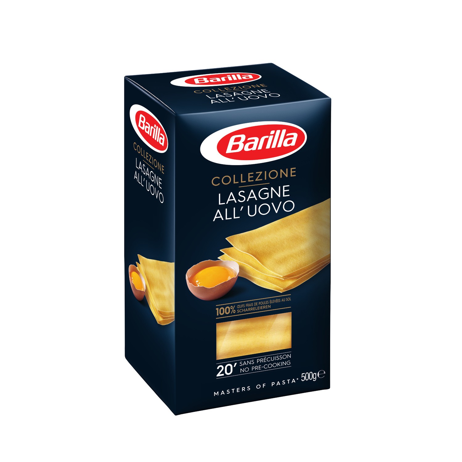 Lasagne all'uovo.Ingrédients : semola di grano duro, uova fresche di categoria A (19.36%).Quantité : 500 gMarque : Barilla