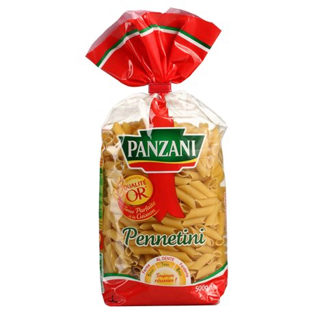 Mini Penne.Ingrédients : 100 % semoule de _blé_ dur de qualité supérieure.Quantité : 500 gMarque : Panzani