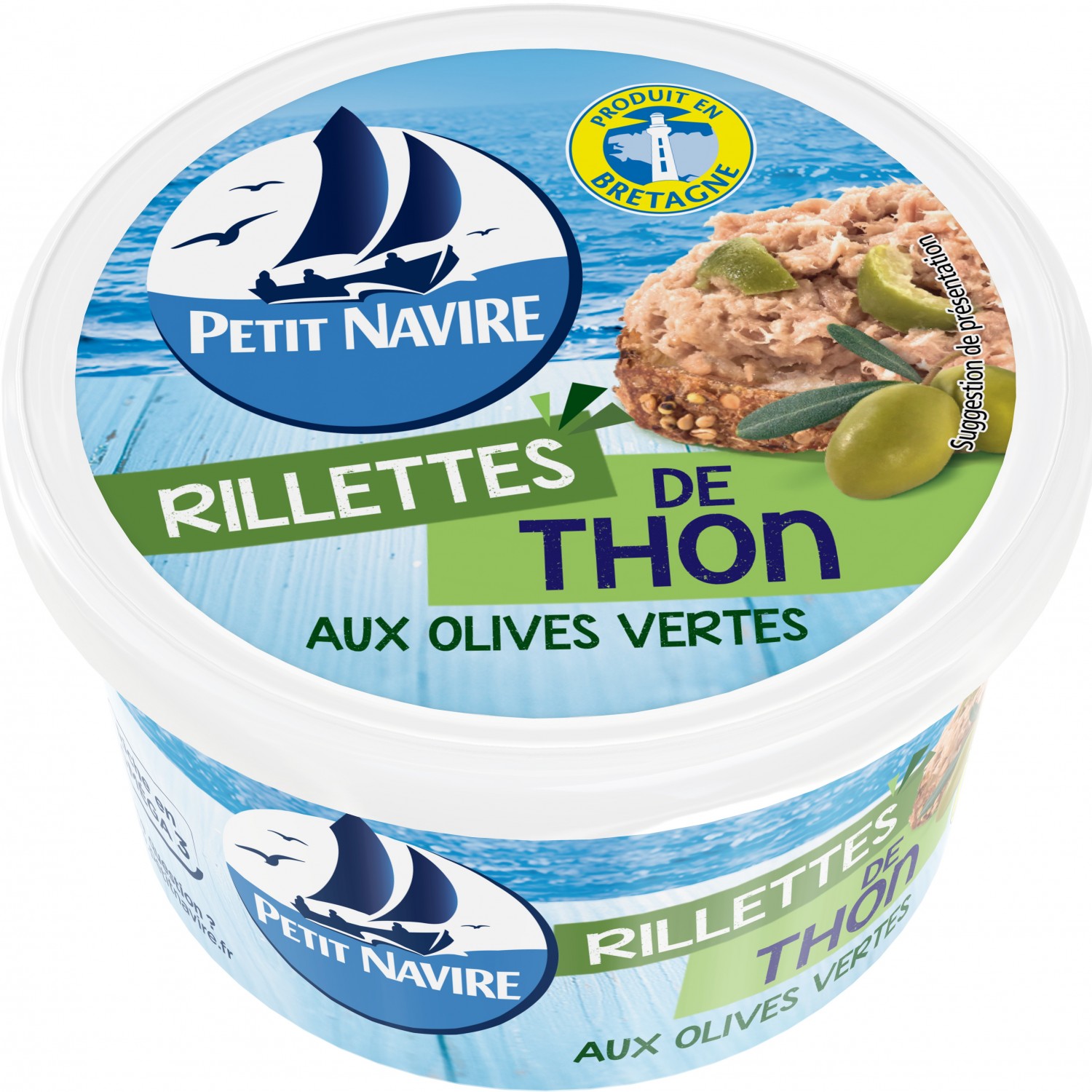 Rillettes de thon aux olives vertes.Ingrédients : _Thon_ 50%, huile de colza, eau, olives vertes 5%, fibres végétales, blanc d'_oeuf_ en poudre, proteines de _lait_,...
