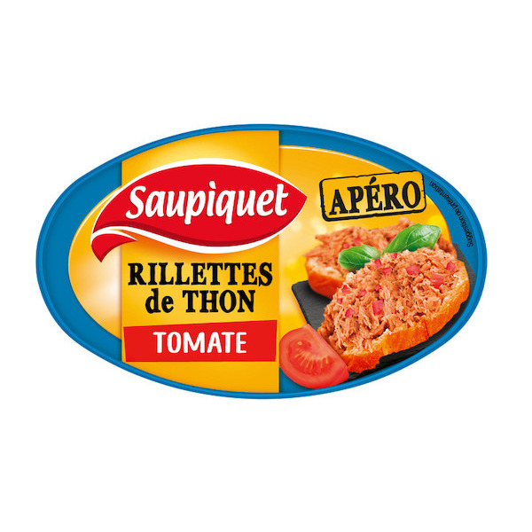 Rillettes de thon aux tomates.Ingrédients : _Thon_ (50 %), huile de maïs, eau, tomates (8 %), amidon de riz, tomates séchées (2 %), arômes, protéines...