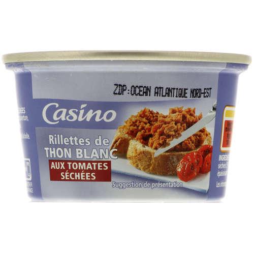Rillettes de thon blanc aux tomates séchées.Ingrédients : _thon_ blanc (germon) 50% - eau - huile de tournesol - tomates séchées 5% (tomates - sel)...