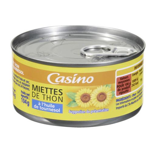 Miettes de thon à l'huile de tournesol.Ingrédients : THON, huile de tournesol, selQuantité : 104 gMarque : Petit navire