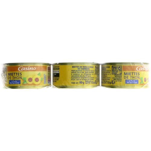 Miettes de thon à l'huile de Tournesol.Ingrédients : _thon_ listao - huile de tournesol - sel.Quantité : PN : 3 x 80 g - PNE...