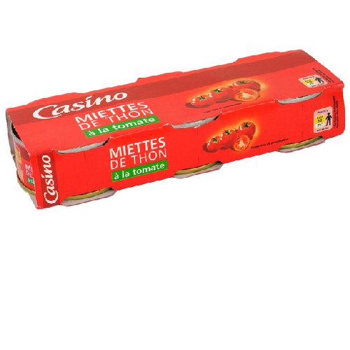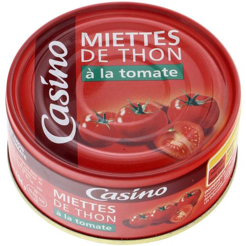 Miettes de thon à la tomate.Ingrédients : _thon_ listao - eau - concentré de tomates 7.5% - huile de tournesol - sel - sucre -...