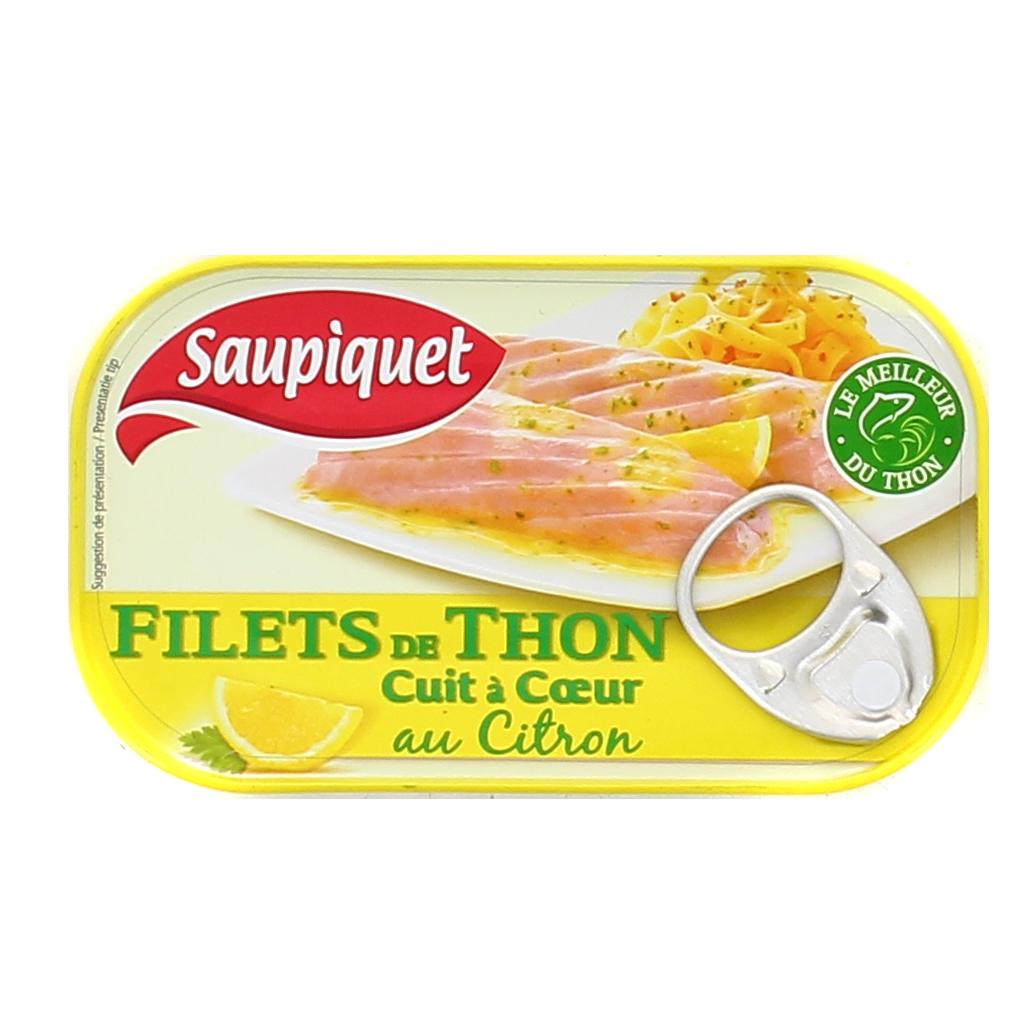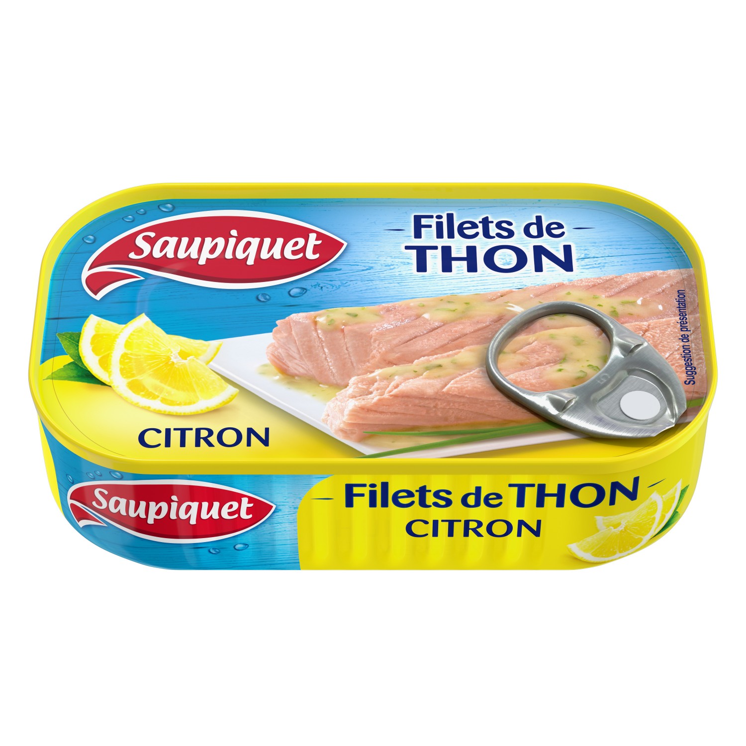 Filets de thos au citron.Ingrédients : Filets de thon (65%), eau, huile de tournesol, vinaigre d'alcool, zestes de citron (3%), arôme naturel de citron (1,4%),...