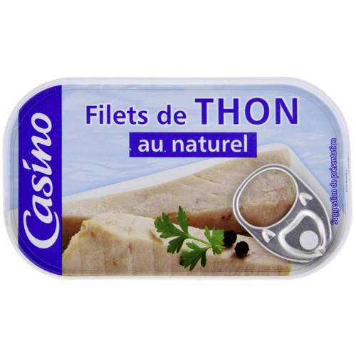 Filets de thon listao au naturel.Ingrédients : _Filets de thon listao_ - eau - selQuantité : 115 gMarque : Casino