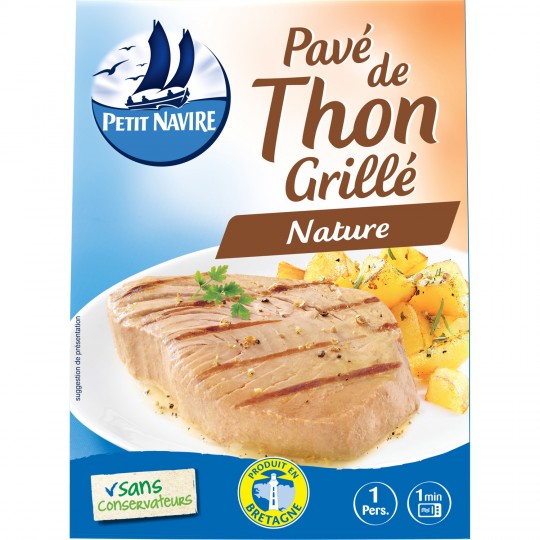 Thon entier au nature.Ingrédients : Thon, eau, sel.Quantité : 140gMarque : Petit NavireOrigine : Voir sur la boîte