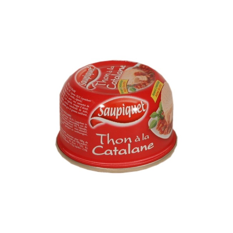 Thon à la Catalane.Ingrédients : Sauce (eau, concentré de tomate 17%, huile de tournesol, vinaigre de vin blanc, sucre, arôme, sel, amidon transformé de maïs,...