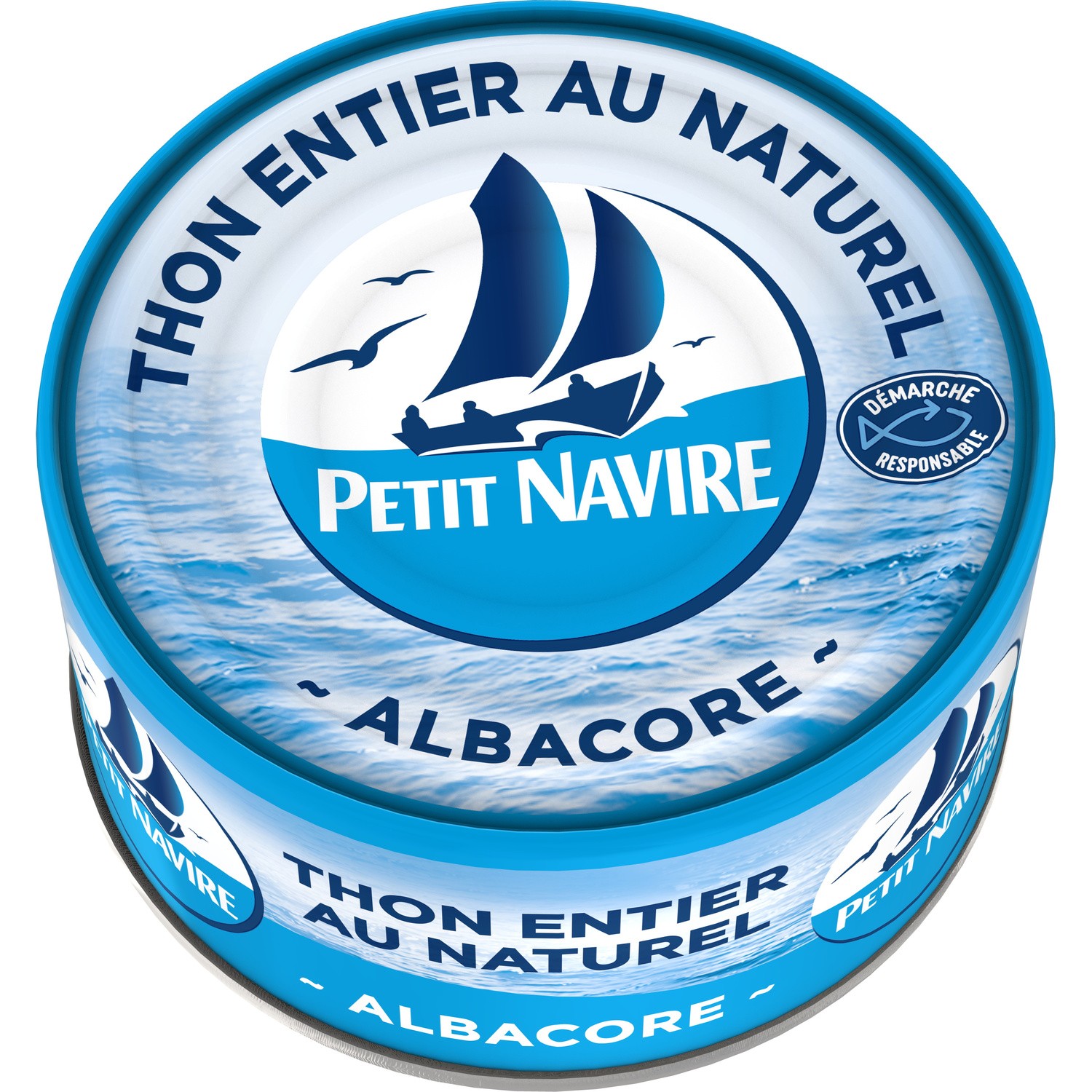 Thon entier au naturel albacore.Ingrédients : _Thon_, eau, sel.Quantité : 190 g eMarque : Petit NavireOrigine : pêcherie