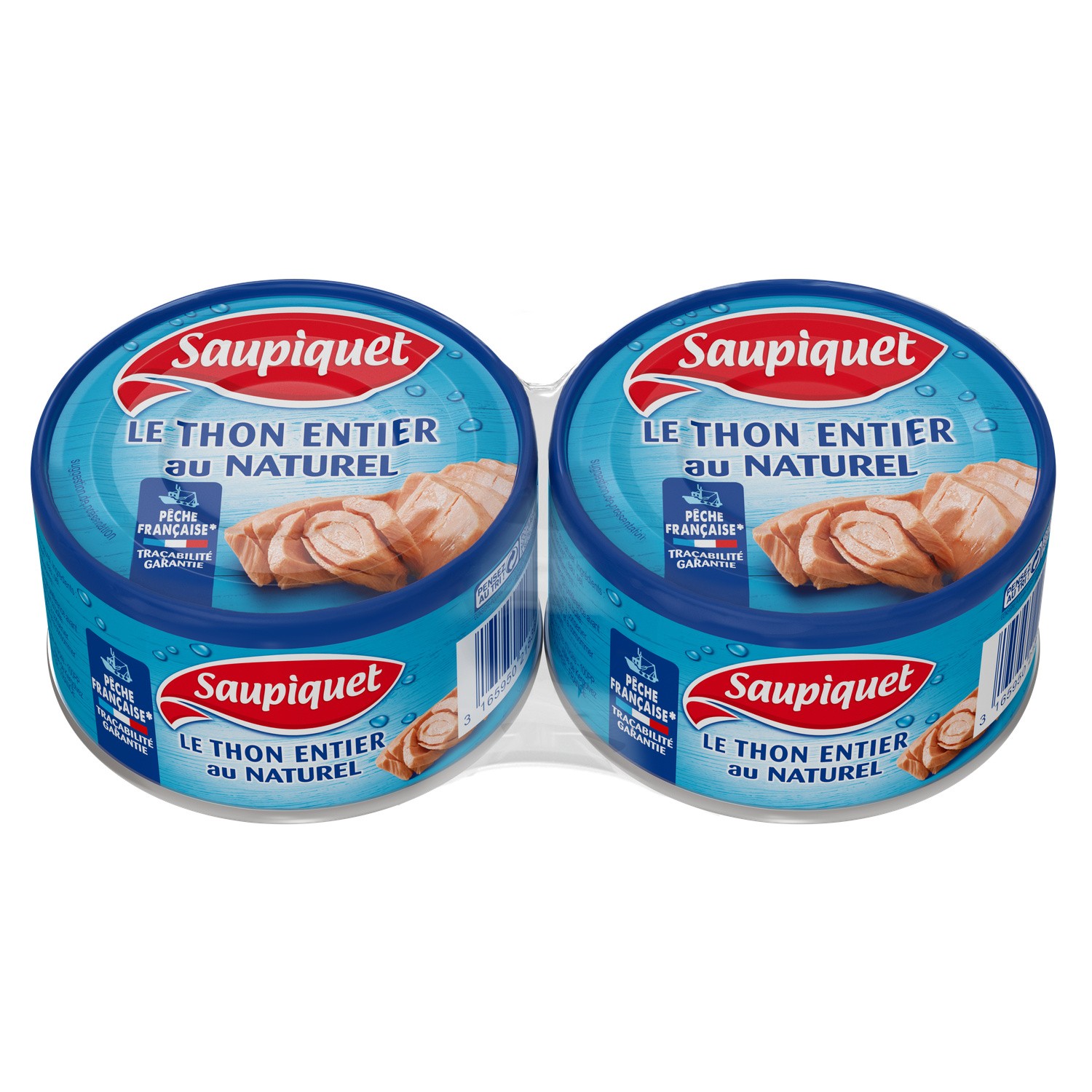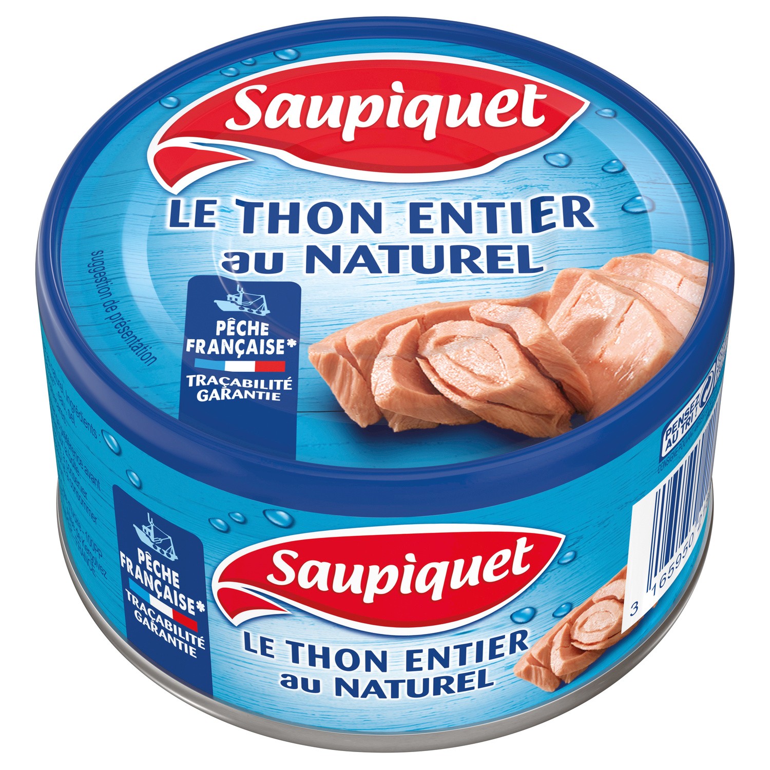 Thon entier au naturel.Ingrédients : Thon albacore, eau, selQuantité : 200g net / 140 net égouttéMarque : saupiquetOrigine : pêche francaisey