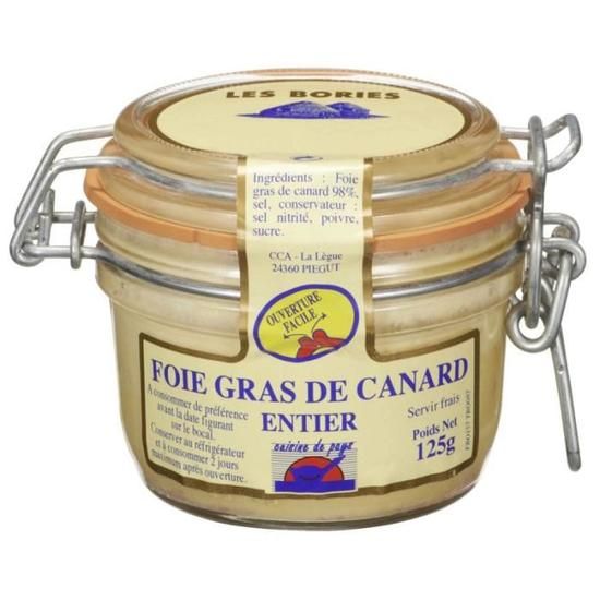 Foie gras de canard entier. Ingrédients : Foie gras de canard 98%, sel, conservateur : sel nitrité, poivre, sucre Marque : Les bories