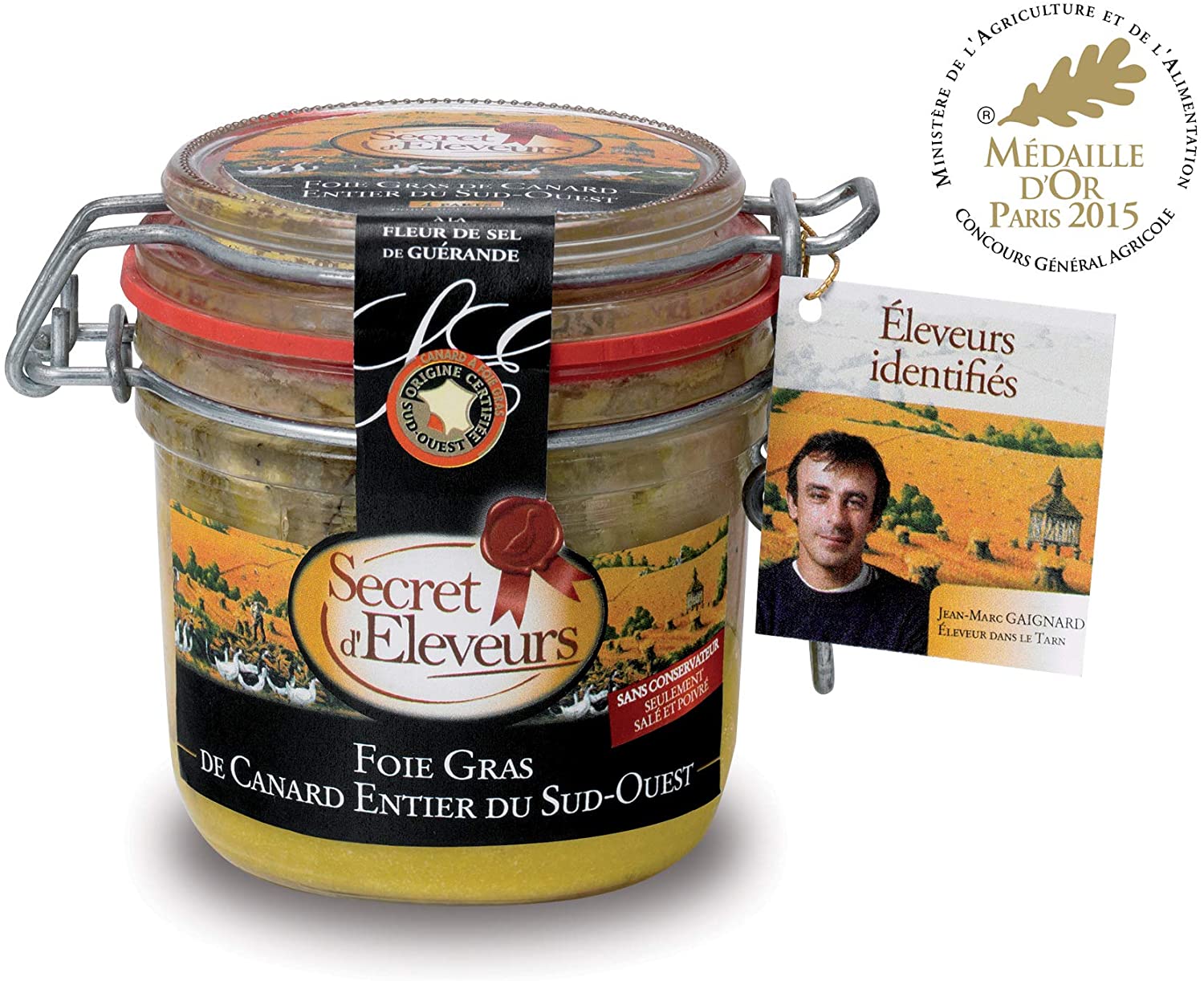 Foie gras de canard entier du Sud-Ouest. Ingrédients : Foie gras de canard, fleur de sel de Guérande (1,3 %), poivre. Quantité : 180 g...