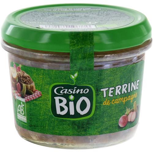 Terrine de Campagne Bio. Ingrédients : Gorge de porc* 52%, foie de porc* 32%, épaule de porc* 7%, _lait_*, _oeufs_*, sel, Cognac*, épices* et aromates*....